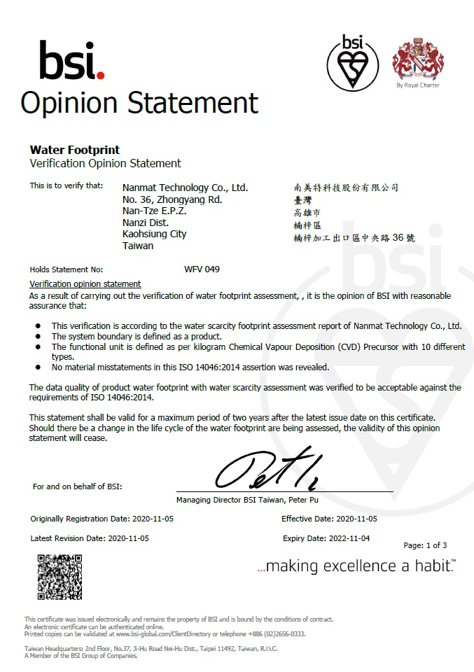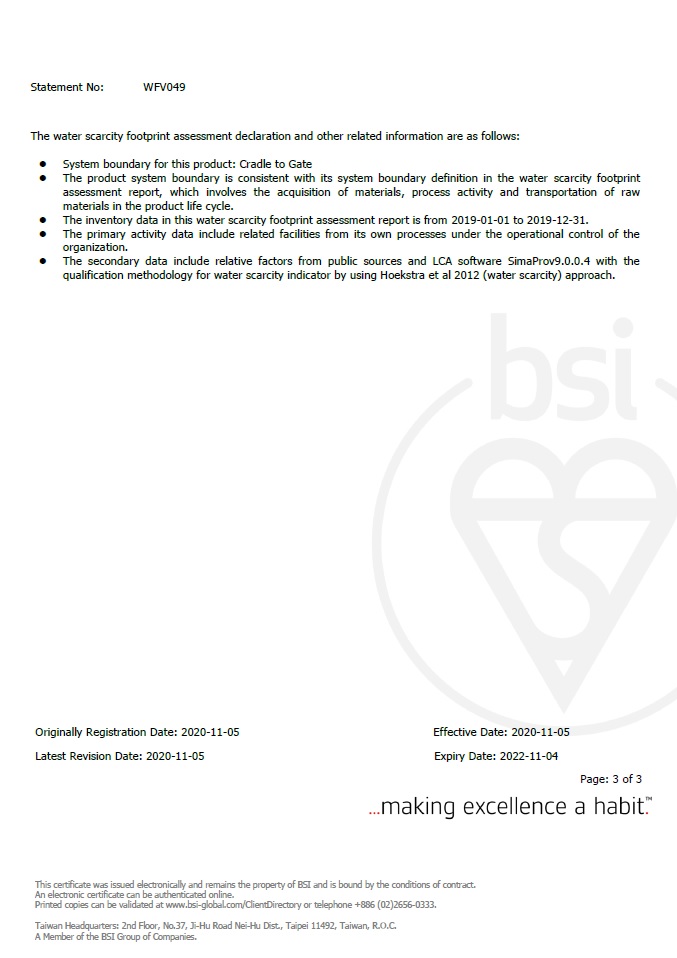 獲頒英國標準協會台灣分公司 BSI ISO14046:2014 水足跡認證-2020/11/05