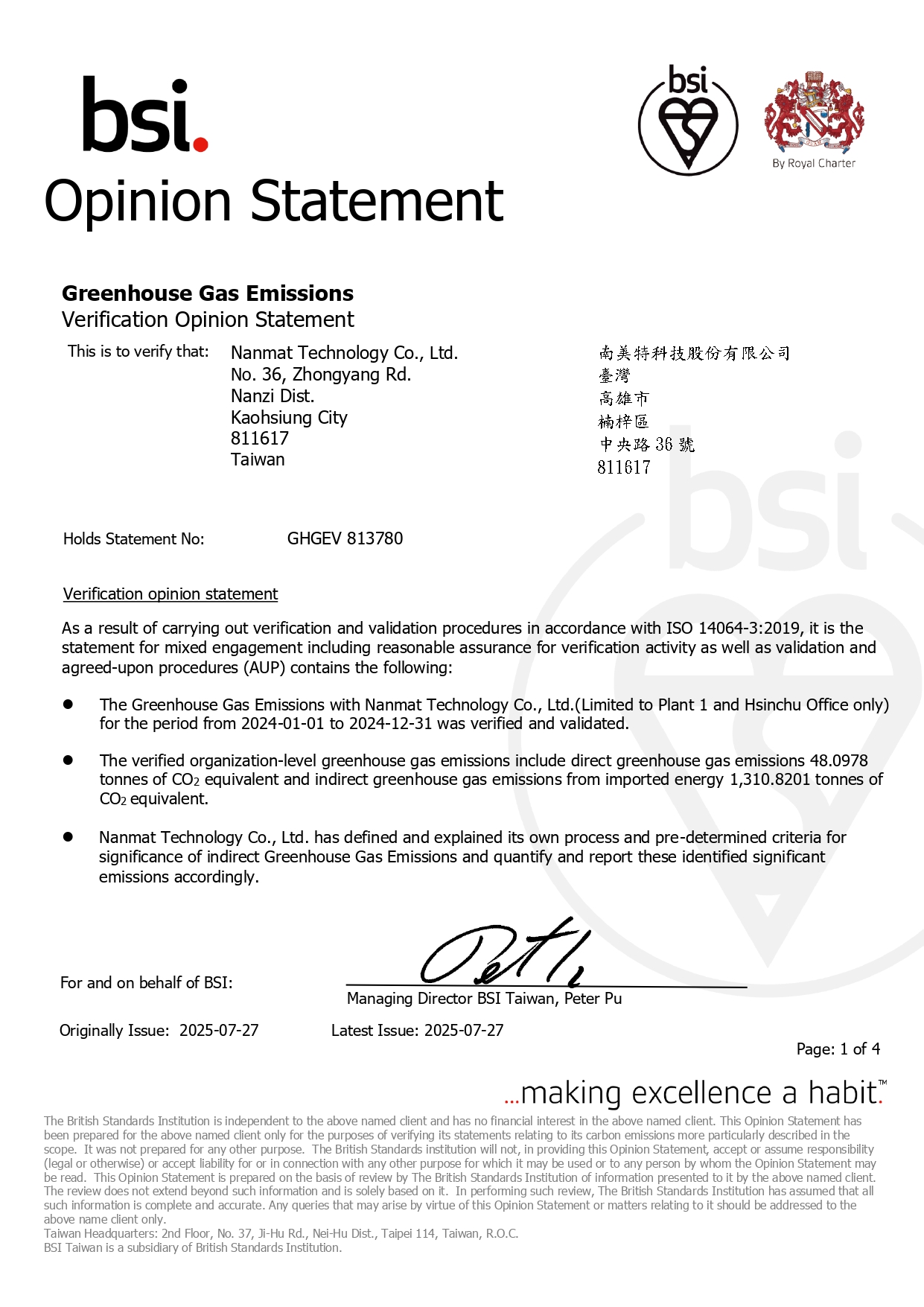 獲頒英國標準協會台灣分公司BSI ISO 14064-3:2019 溫室氣體查證-2025/07/27