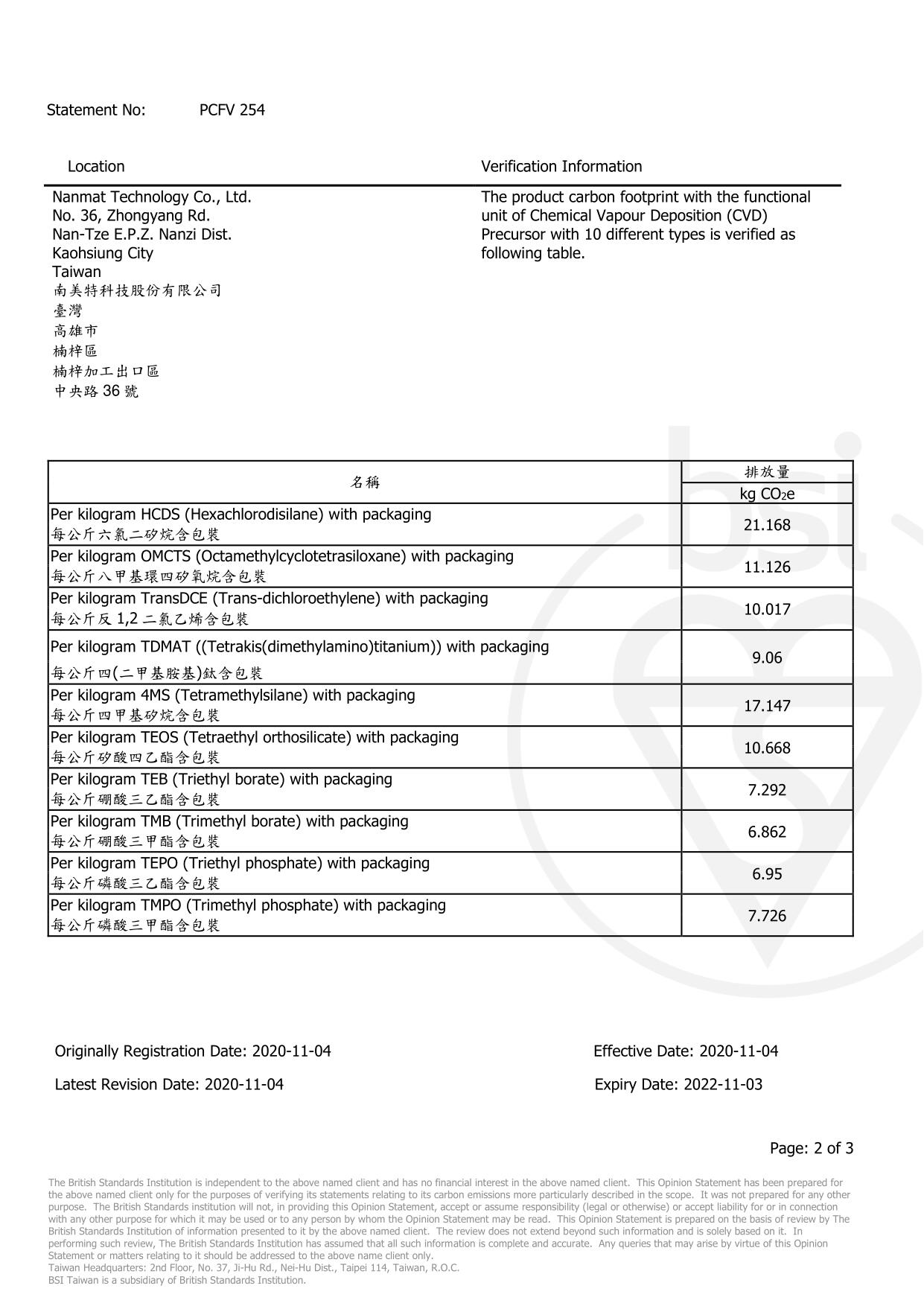 獲頒英國標準協會台灣分公司 BSI ISO 14067:2018 碳足跡認證-2020/11/04