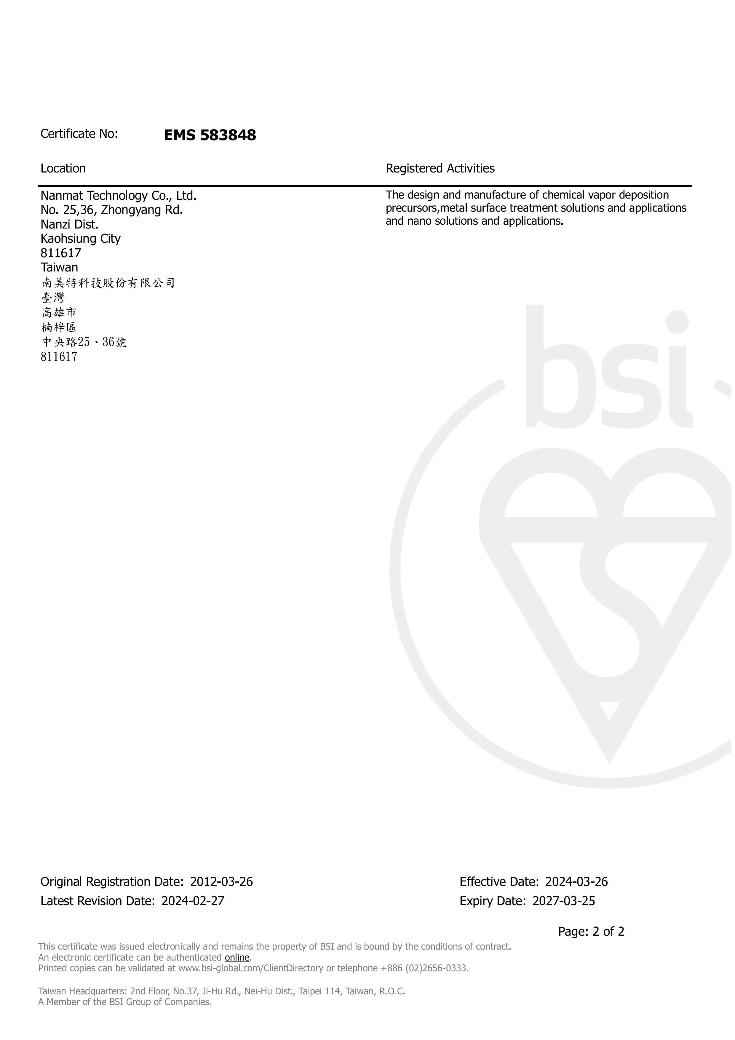 獲頒英國標準協會台灣分公司 BSI ISO14001:2015 認證-2024/03/26