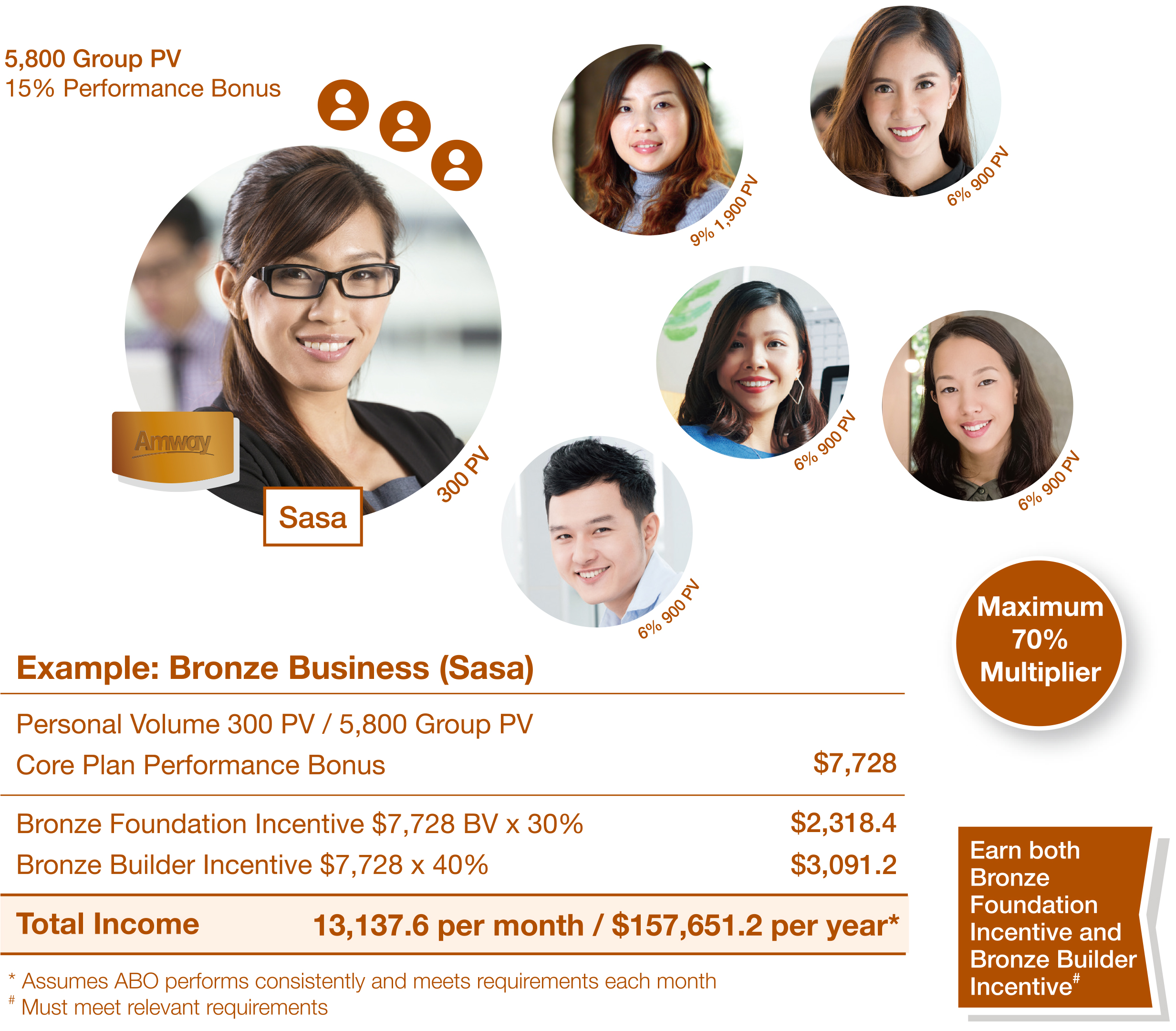 - If ABOs are qualified for Bronze Builder Incentive, they can receive both Bronze Foundation Incentive and Bronze Builder Incentive in the same month.