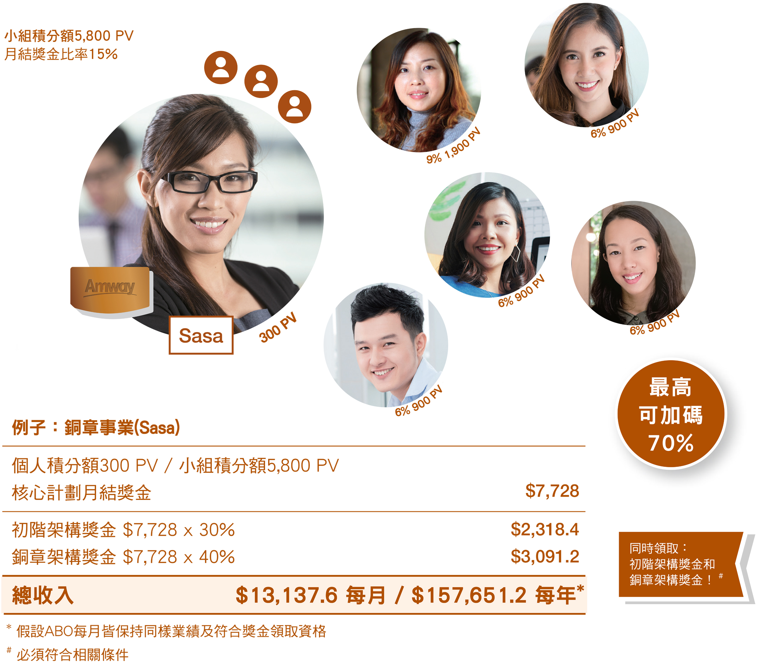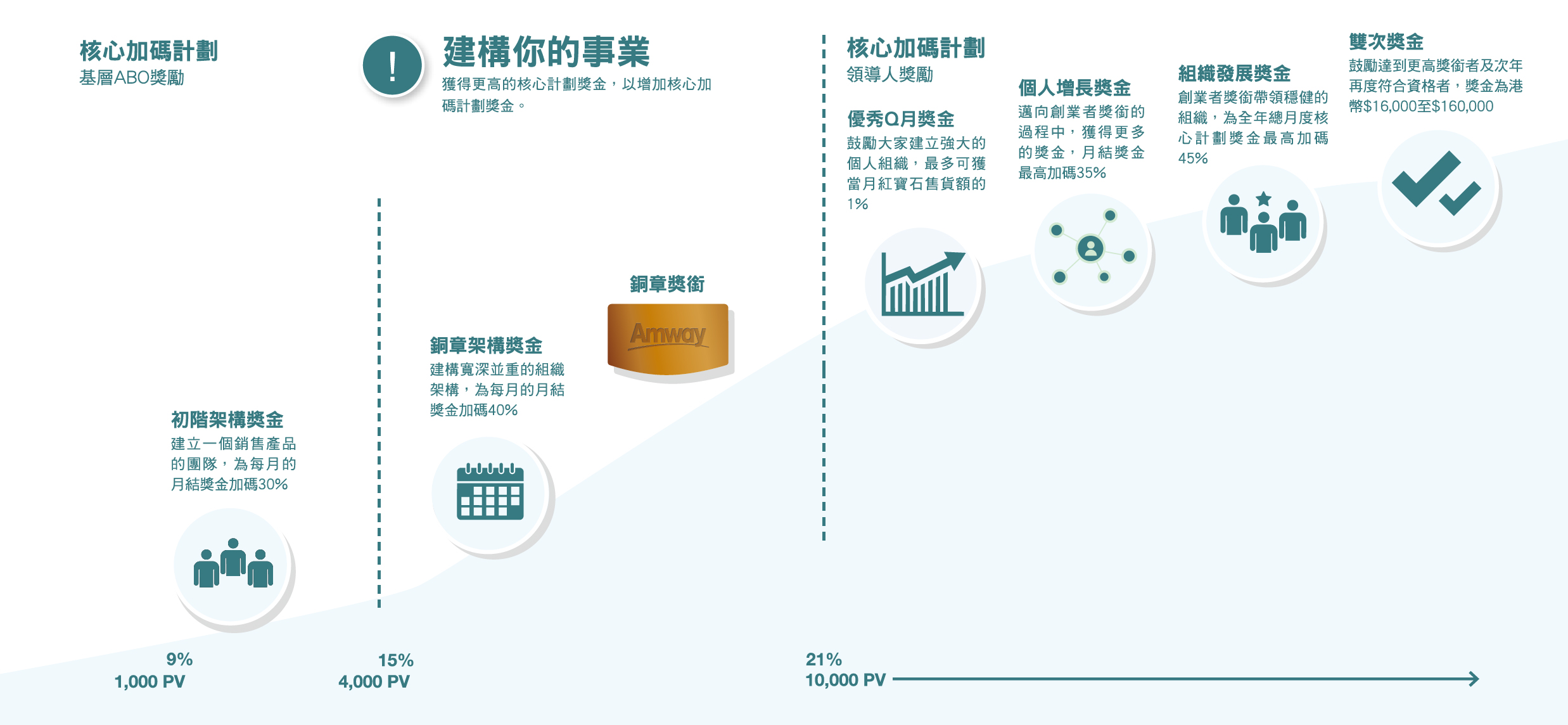 1. 如安利企業家同時符合領取初階架構獎金的資格,則可同時領取初階架構獎金及銅章架構獎金。